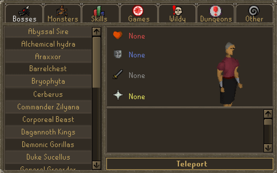 The Teleport Beam can be used to teleport to Bosses, Monsters, Skill locations, Minigames, Wilderness locations, Dungeons, and Cities (Other).