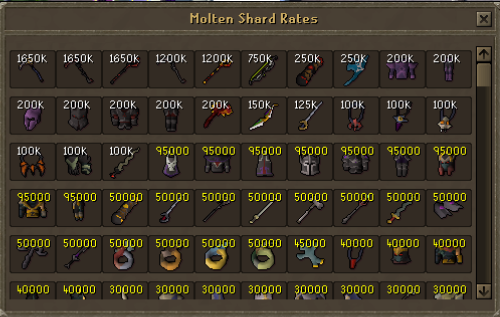 The FoMS is where you can sacrifice equipment, sigils, clue items, and misc boss drops to get shards ( right click the FoMS flame to see the sacrifice rates ). The shards can be exchanged for items in the Molten Shards Shop.