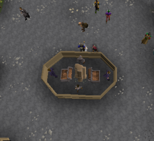 West of the Fire of Molten Shards(FoMS), Upgrade Anvil, Teleport Beam, and Refreshing Pool is Grace, Sigmund the Merchant, and Thieving Stalls.